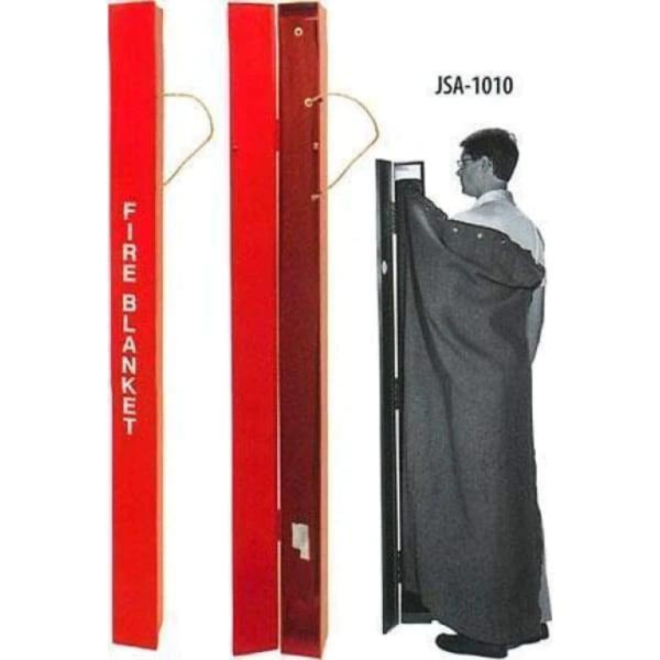 Kit consists of Fire Blanket (JSA-1010-B) Wool Blend for maximum fire protection and sturdy 20 Ga. Steel Cabinet (JSA-1010-CW) ready for wall mounting. Cabinet is bright red enamel with white lettering. Viewing hole provided to see if blanket is in place.